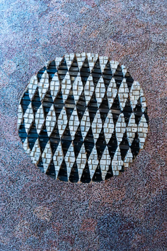 The exhibition’s title Eregata እርጋታ emerges from the artist’s language, Amharic, and is translated by Elias to the English word serene. For Elias, eregata reflects a recognition that our minds are never truly still or silent: ‘we struggle to stop and sleep because our brains are constantly stimulated by technology – we are constantly moving faster not slower.‘ Elias’s work flows against this tide, embracing a notion of slowness – ‘My art is slowing it down. The work forces me to slow down’ – as he takes years to transform carefully sourced materials to explore local and global issues around sustainability, materiality and the impact of technology.
