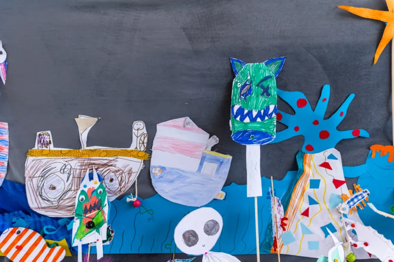 This year, 400 children from eight local schools have created a series of collaborative art pieces exploring their relationship with the sea, including cyanotype banners, mosaics, clay tablets, algae-dyed fabric, puppets, stick-and-ink illustrations and two on-site installations.